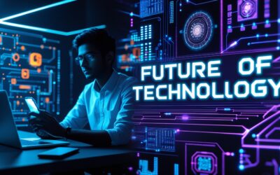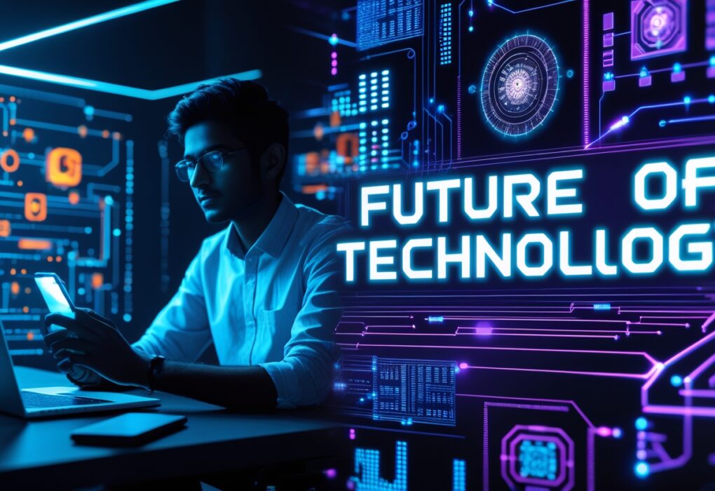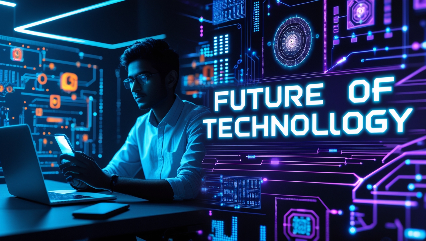 Prompt:A futuristic technology YouTube thumbnail, half side showing a young Indian tech creator sitting with a laptop and smartphone glowing in blue neon light, the other side filled with futuristic holograms of AI, robots, microchips, coding lines, and digital circuits. Bold modern text in English “Future of Technology” written in glowing cyber-style font. Background with…